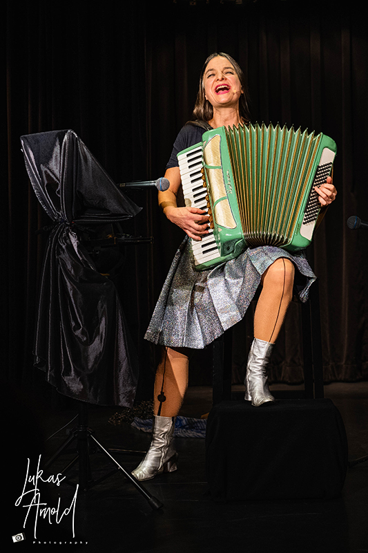 Die Performancekünstlerin, Musikerin und Autorin singt ihre Urbanen Lieder zum Akkordeon und liest aus ihrem sprachspielerischen fiktiven Brandenburger Brief – Bettina von Arnim an Achim von Armin.