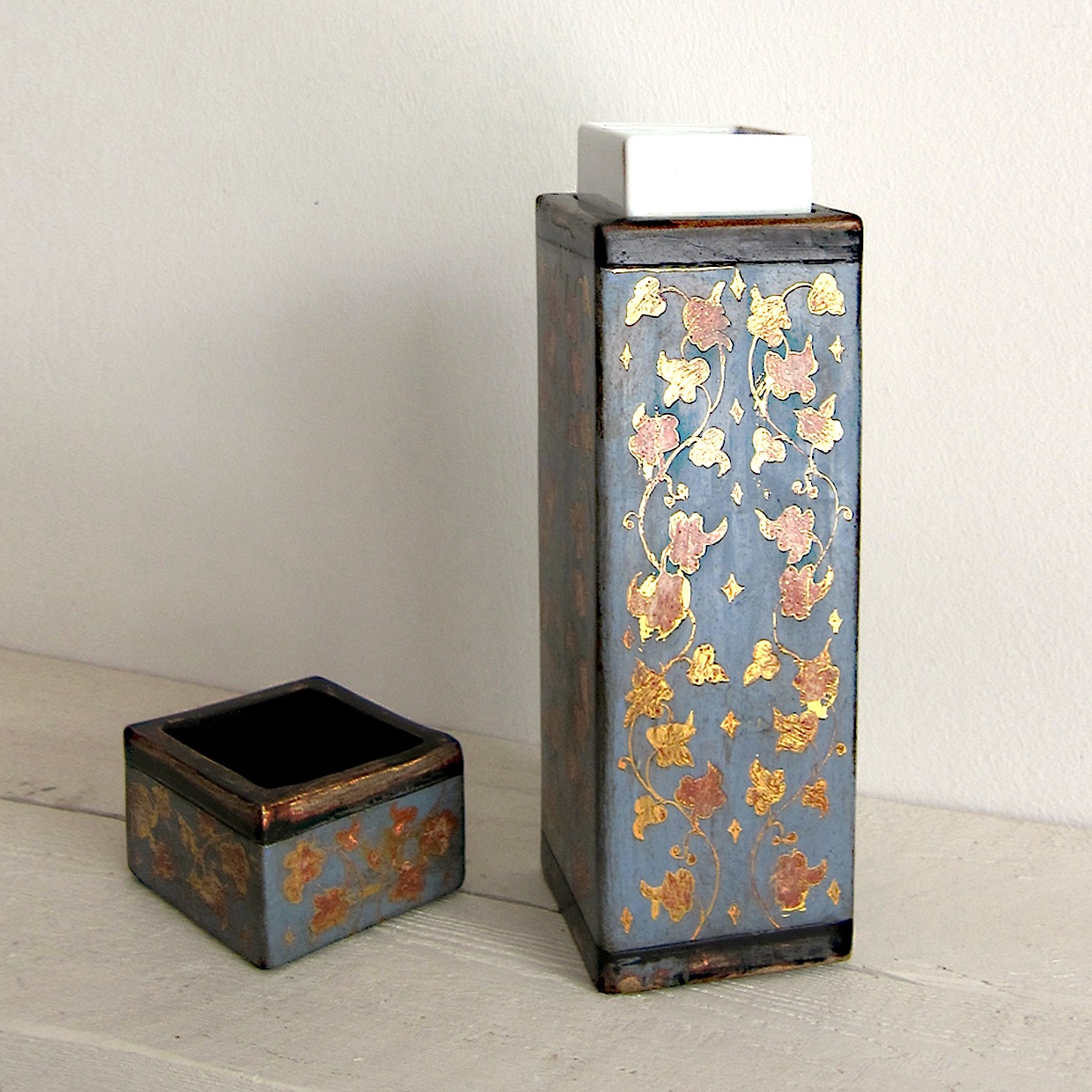 Neben meinen handgefertigten Bilderrahmen zeige ich in diesem Jahr auch eine neue Reihe meiner holzummantelten Vasen. Diese Vasen habe ich angefertigt und gefasst. Hierzu habe ich die Vergoldungstechniken aus der Gotik, Renaissance und dem Barock angewandt.