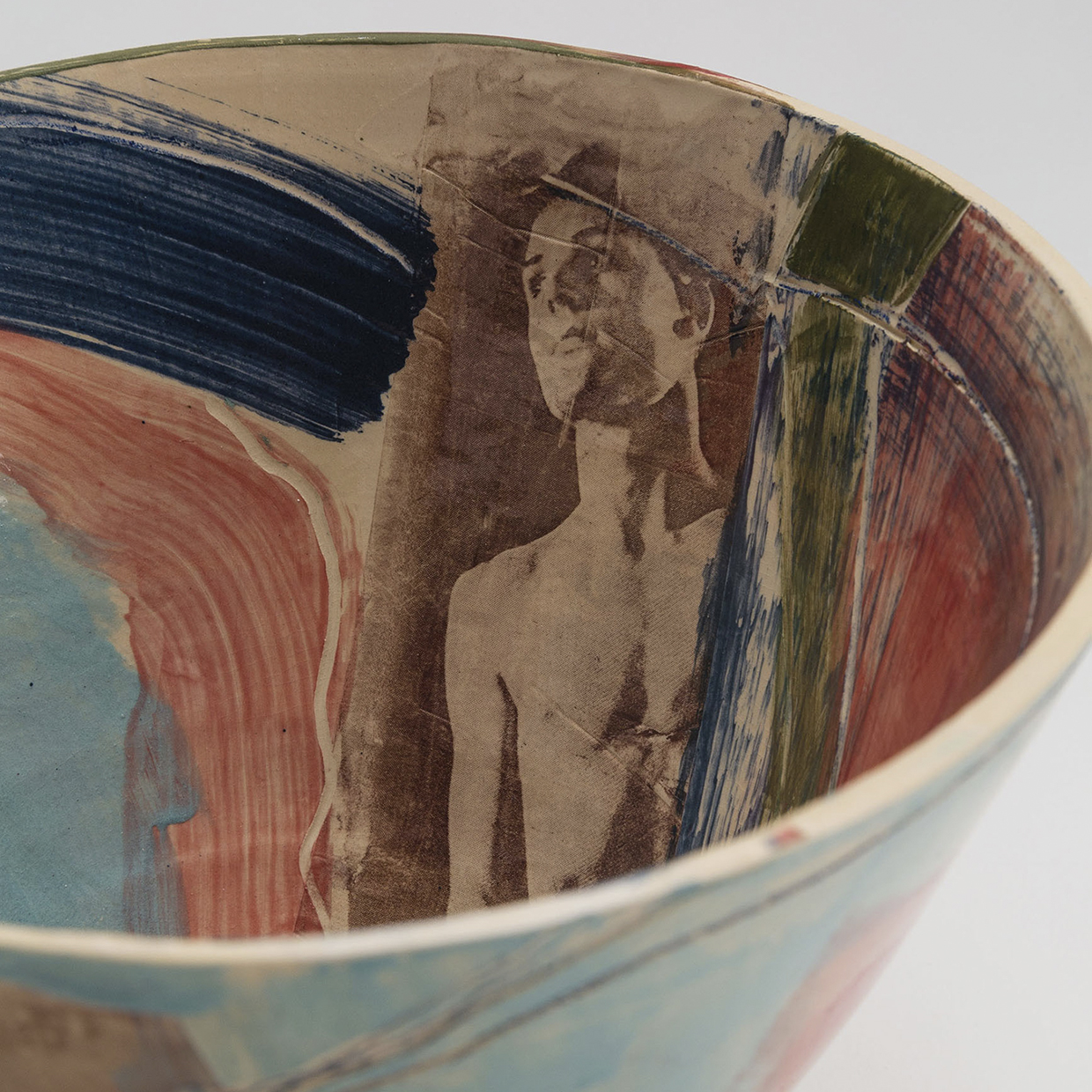 Die Arbeiten entstehen auf der Töpferscheibe. Mit Malerei (Engoben & Farbkörper), Zeichnung, Sgrafitto und einem speziellen Mono-Printverfahren, bei dem sich Fotos in Ton einbrennen lassen, entsteht eine weitere bildnerische und räumliche Dimension.