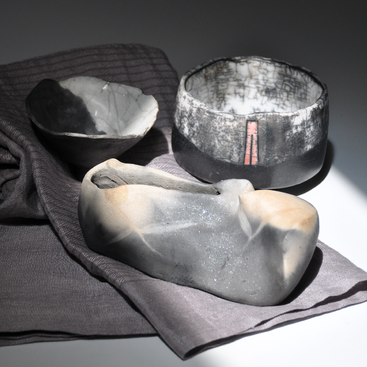 Inspiriert von Wabi-Sabi und japanischer Ästhetik entstehen Unikate aus farbigem Porzellan. Naturspuren bei Porzellanformen aus Baumrinde und Zufall beim Raku- & Grubenbrand vereinen Design, angewandte Kunst und Handwerk zu stillen Objekten, die Geschichten erzählen.