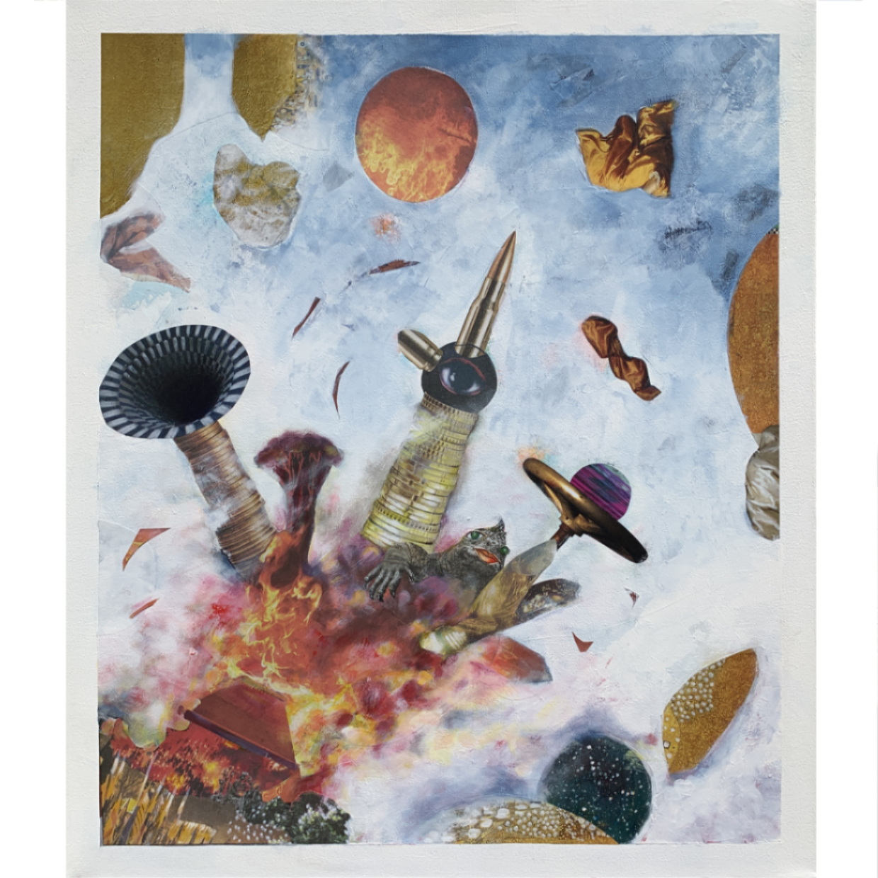 Zeitungsfotos – zerlegt, zerschnitten, dekonstruiert – sind malerisch verbunden und in eine surreal und traumartig anmutende Bildsprache transformiert. Collage als visueller Spiegel, der die Spannungen und Unsicherheiten unserer Zeit auf eine poetische und zugleich kritische Weise sichtbar macht.