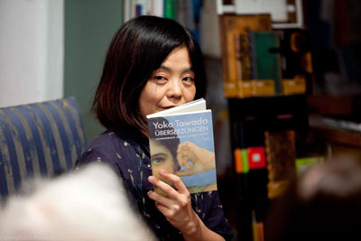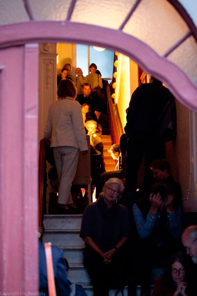 Uta Stolle liest aus ihrem Buch "Das resedagrüne Sofa" im Treppenhaus der Niedstraße 14, des Ateliers von Uwe Johnson