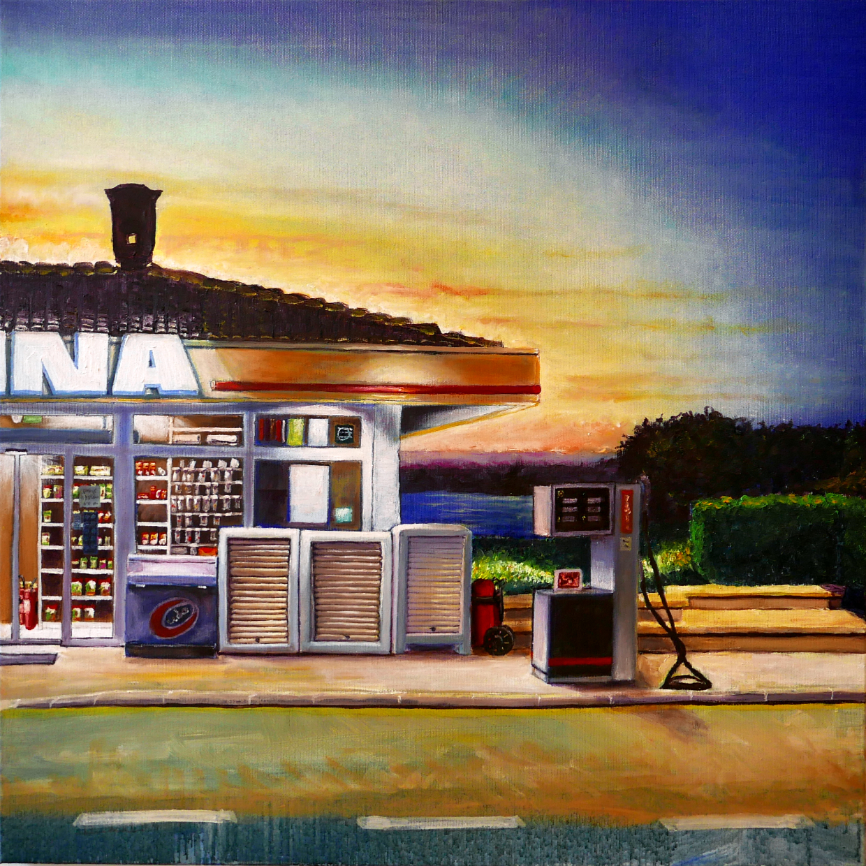 Tankstellen sind eins der großen Themen von Katja Krämer, sowohl fotografisch als auch in ihren oft quadratischen Ölbildern wie hier bei einer Tankstelle in Kroatien. Dabei geht es ihr nicht um den geografischen Ort, sondern auch um Anziehungspunkte und darum weiterzusehen, um Stimmungen, wie sie beim Verweilen und Weiterfahren an vielen Orten entstehen können.