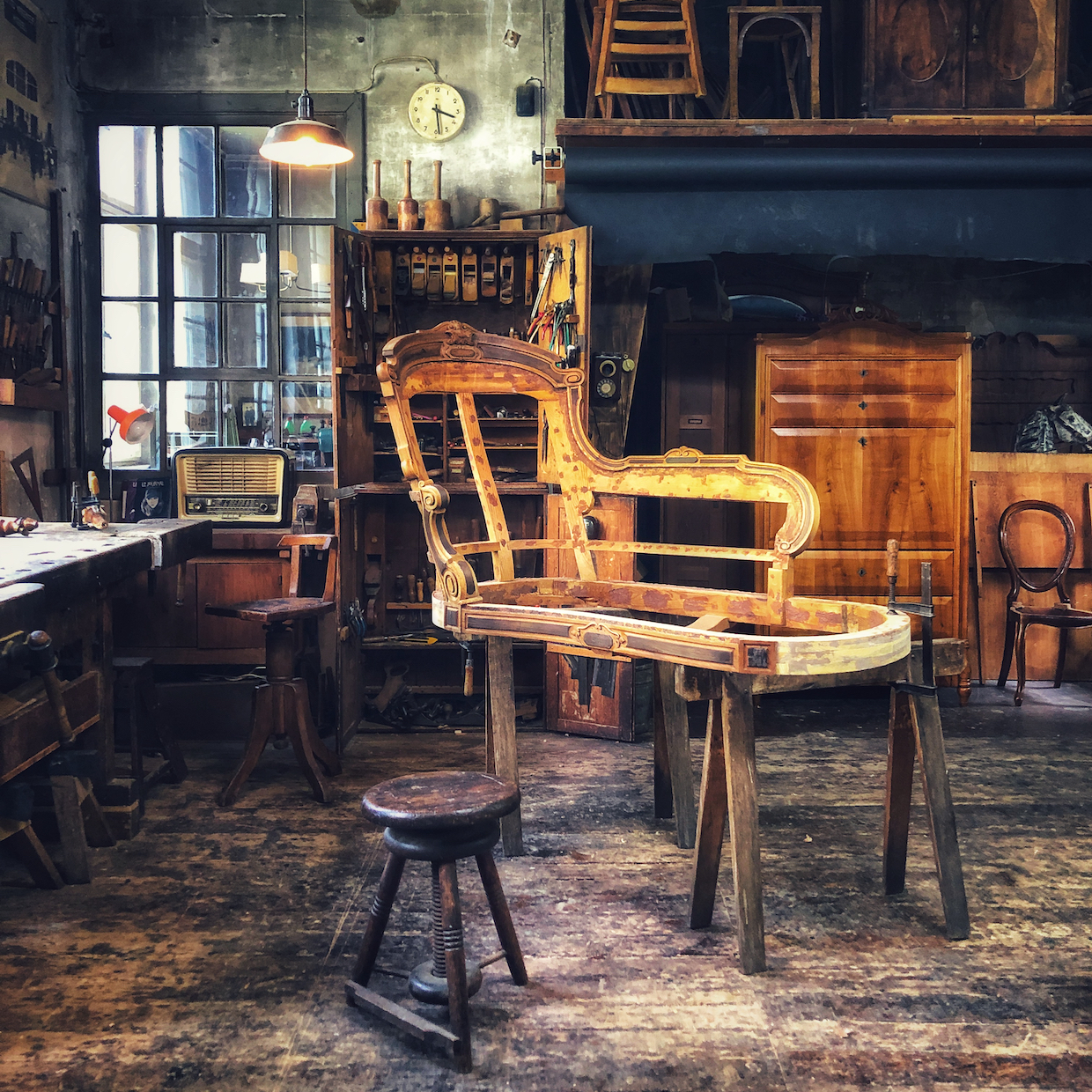 Wer die alte Werkstatt besucht, fühlt sich nicht nur an einen anderen Ort, sondern auch in eine andere Zeit versetzt. In einem Hinterhof eines gewöhnlichen Mietshauses befindet sich die Remise, die Michael Wintjen als Werkstatt dient. Patina und altes Holz prägen das Bild. Fast scheint hier die Zeit stehen geblieben zu sein. Der Ort ist geprägt von einer großen Ruhe und Gelassenheit. Man hat das Gefühl, Zeit spielt keine Rolle. Der perfekte Ort, um sich mit alten Möbeln zu beschäftigen.