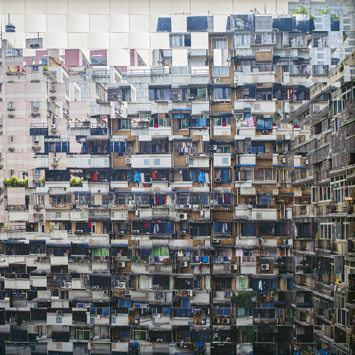 Sabine Wild verwebt Farbfotos, die sie in Hongkong, Chongqing sowie in Las Vegas aufnahm. Massensiedlungen werden bildnerisch in eine geradezu absurd gigantische Dimension überführt und damit zu einer Science Fiction der ambivalenten Art erklärt.