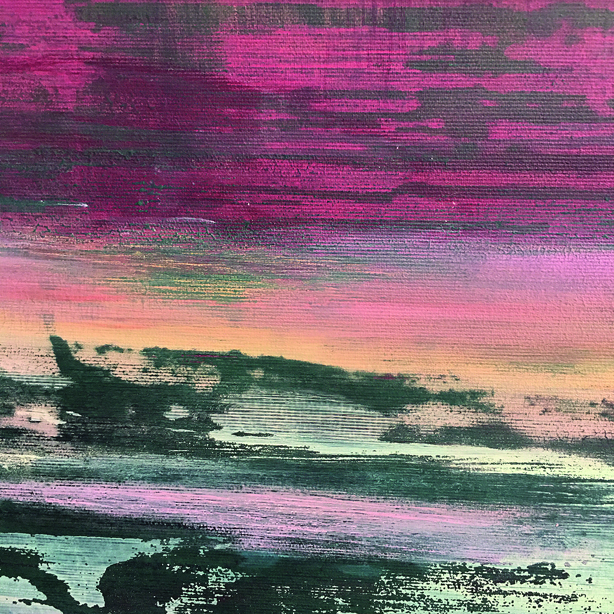 Abstrakt, klein, groß, mit Acryl und Pigmenten – pastose tiefe Farbschichten in starken Hell-Dunkel-Kontrasten treffen auf weite Linien fließender wässriger Farbtöne, die sich einem Horizont gleich über dem Meer treffen könnten. Durch den suchenden Dialog mit der leeren Leinwand und dem experimentellen Einsatz verschiedener Malmaterialien, mittels Kombination offengelassener Reaktion, Wegwaschen und Übermalung, erschafft sie über den langwierigen Malprozess eine neue sensible Wirklichkeitsebene.
