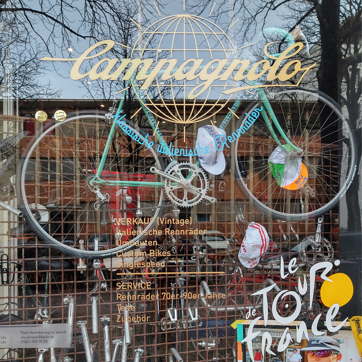 Das Bici da Corsa ist ein Ort, der die goldene Ära der italienischen Rennräder sichtbar macht. Wir kümmern uns um die Erhaltung dieser Räder, wir restaurieren und verkaufen. Unser Geschäft zeigt eine Auswahl teils seltener Marken, Rahmen, tolle Details, Pantographien mit Geschichte und unbedingt die Leidenschaft, die in die Entwicklung und den Bau dieser Räder geflossen ist.