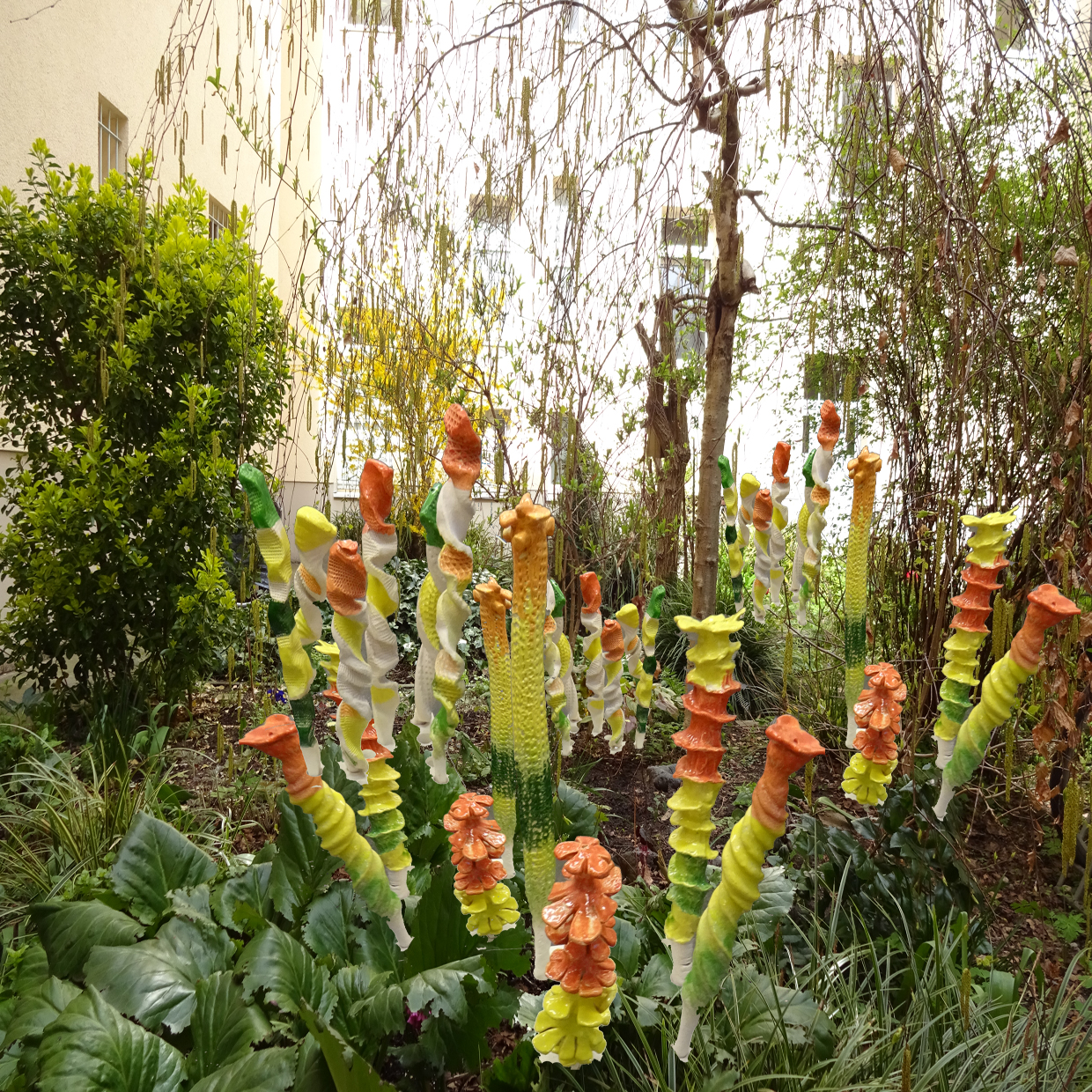 Nele Ströbel und Claudia Busching (claudiabusching.de) zeigen botanisch inspirierte Plastiken und strukturelle Raumzeichnungen im Dialog. Die durchaus konträren Auffassungen von Innen- und Außenraum werden in der Tiefparterrehalle und dem Gemeinschaftsgarten von Nele Ströbels Atelier erlebbar. Hier entsteht auch ein Gemeinschaftsleporello auf Bütten. Dies wird im Rahmen der Ausstellung „Nomadensalon II“ (Neustartstipendium der Stiftung Kunstfond) mit Atelierfilmen (Soundtrack) und weiteren Objekten gezeigt. Musiker*innen welcome!