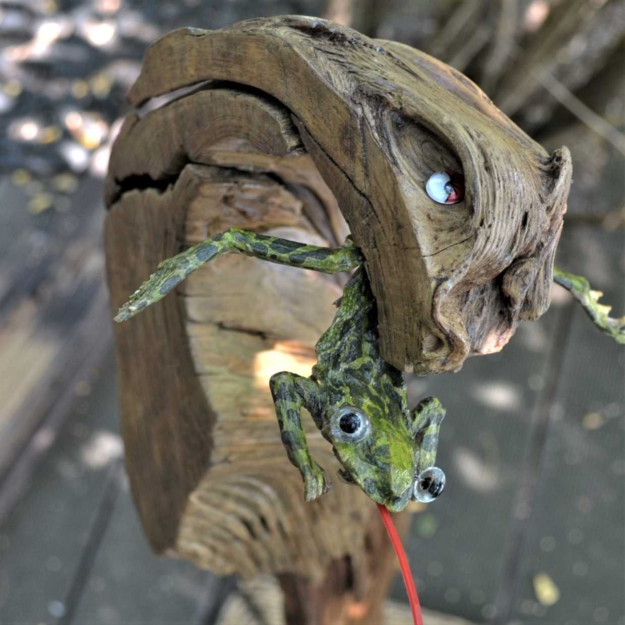 ...und in die Maske gebeten. Fundholz bietet sich als Projektionsfläche für meine Assoziationen an. Ich suche das Holz nicht - es kommt zu mir (das ist wie mit der Liebe, aber viel häufiger). Es entstehen Psychogramme (meist) irdischen Daseins (oft: als wärs ein Stück von mir). Kombiniert mit anderen Fundstücken hängen sie dann, oder stehen, oder liegen.