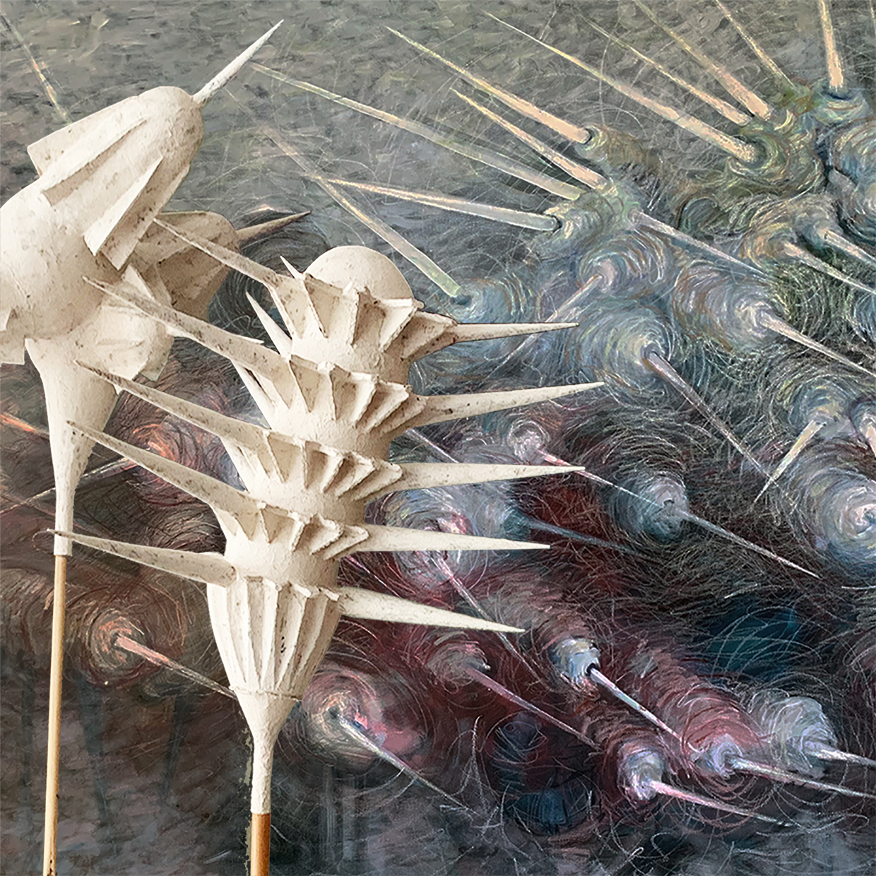 Die Objekte und Malerei sind ein künstlerischer Ausdruck meiner Auseinandersetzung mit den Auswirkungen des Klimawandels auf die Natur und uns. Sie verbildlichen den Spannungsbogen zwischen Widerstand, Endlichkeit und neuen Daseinsformen.